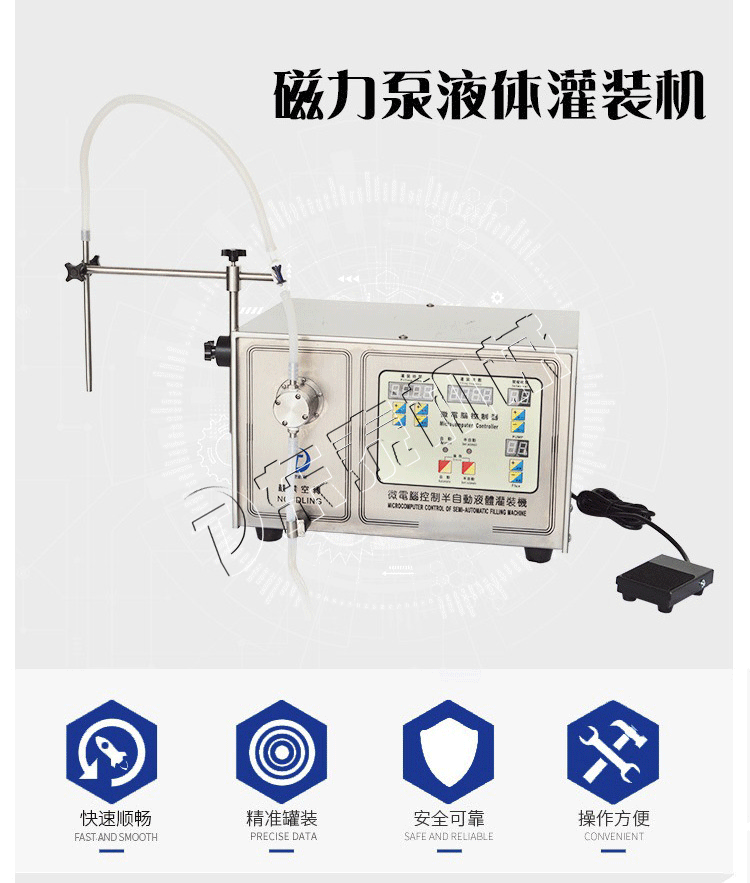 醫(yī)用小型液體灌裝機(jī)又叫小型磁力泵灌裝機(jī)可灌充絕大類型的液體,包括高粘稠度的液體。醫(yī)用小型液體灌裝機(jī)是利用位電腦對微型水泵在灌裝時間、電機(jī)轉(zhuǎn)速等因素上的控制,達(dá)到均勻的、重復(fù)誤差極小的液體灌裝方式,廣泛的應(yīng)用于藥物、化工、食品、飲料、油脂、化妝品等行業(yè),適用于低粘度、無顆粒的液體分裝、小批量生產(chǎn)。