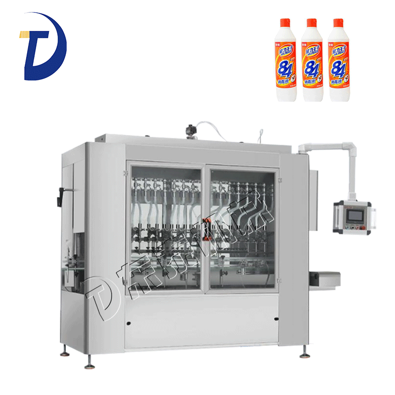 說明:該84消毒液灌裝機設(shè)備,根據(jù)客戶物料,可定制為防腐,防爆機型。與自動理瓶機、自動旋蓋機、標(biāo)簽貼標(biāo)或套標(biāo)機、裝箱打包機組成灌裝流水線。