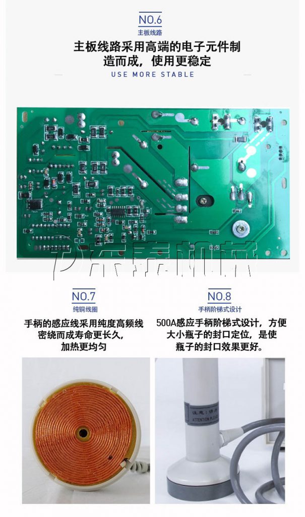 小型半自動(dòng)鋁箔封口機(jī)采用國(guó)外先進(jìn)線路,選用日本最新模塊化功率器件,較于一般電子感應(yīng)加熱器更省電,熱效率達(dá)到90%以上,瞬時(shí)加熱速度為后者的20-30倍,因此不僅適用于熱封性能較好的聚乙烯、聚丙烯材質(zhì)的瓶體,而且對(duì)熱封性能較差的聚酯瓶、玻璃瓶也有極好的封口效果。